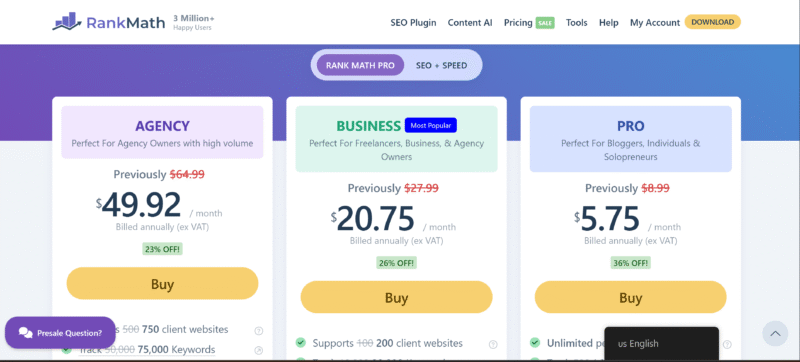 Yoast’s single-site license feels heavy once you manage multiple domains. Rank Math’s pricing, though, leans toward agencies and multi-domain setups.