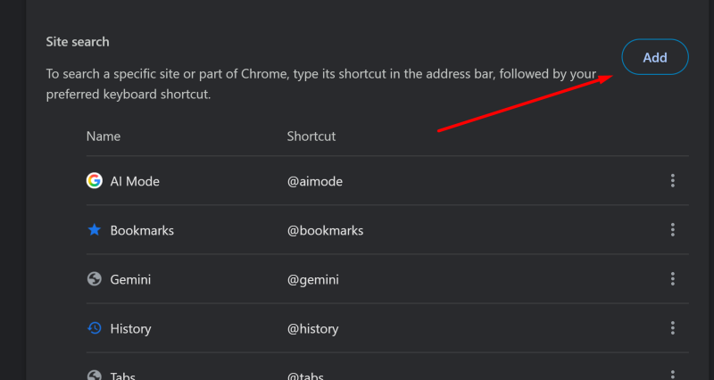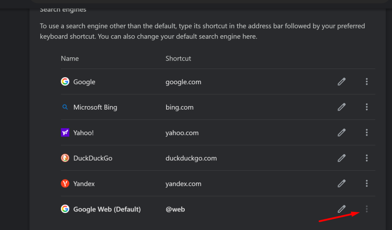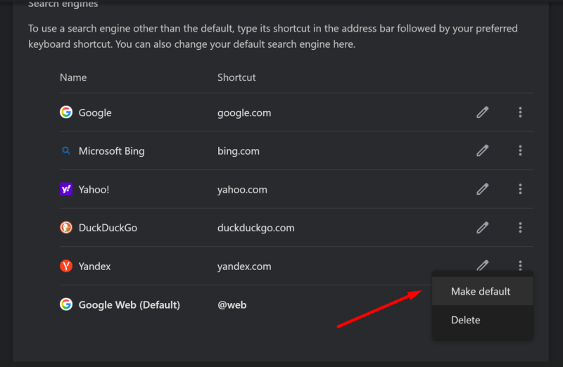 {google:baseURL}template, use this URL instead: https://www.google.com/search?q=%s&udm=14 - Now go back up to Search engines, find Google Web, click the 3-dots menu, and choose Make default.