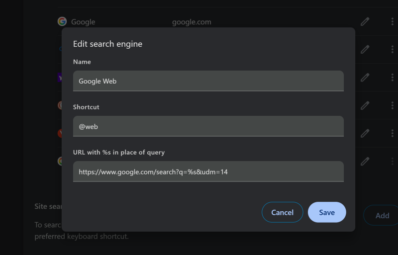 Search engine:Google WebShortcut:@webURL:{google:baseURL}search?q=%s&udm=14
